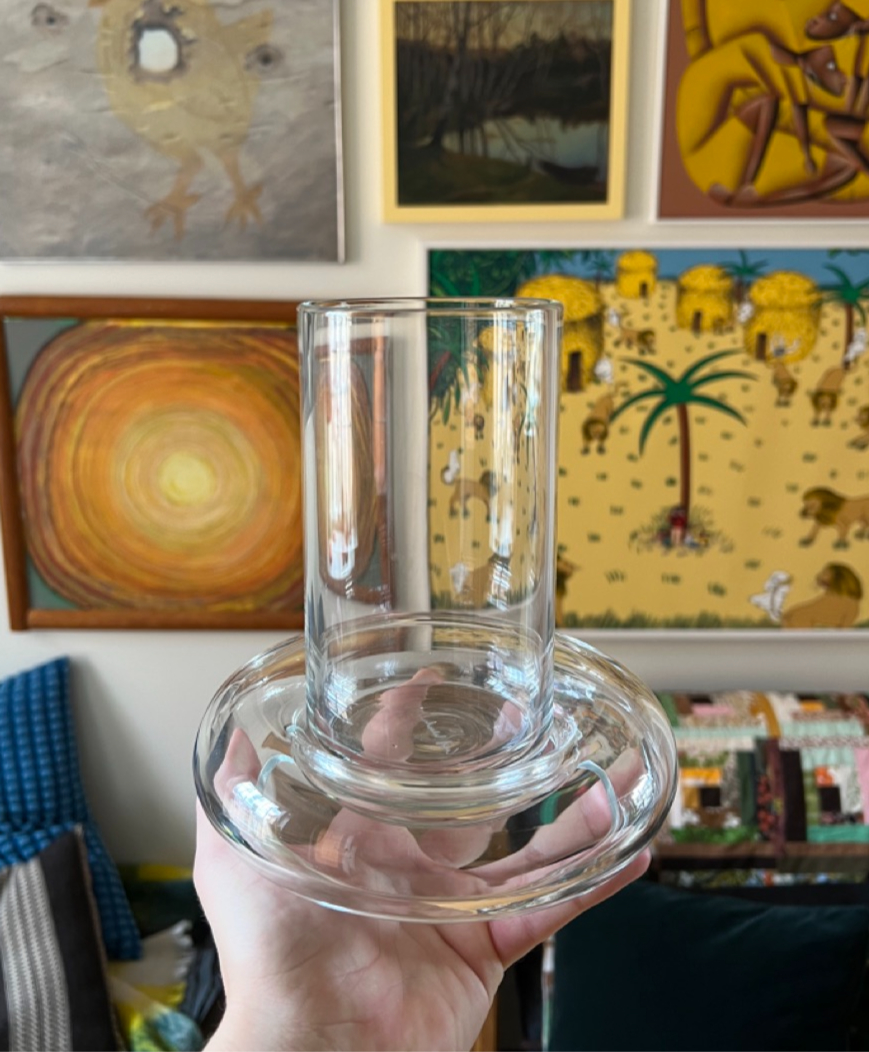 Chunky glass vase and saucer. Each piece is hand-blown, with variations in color and dimensions